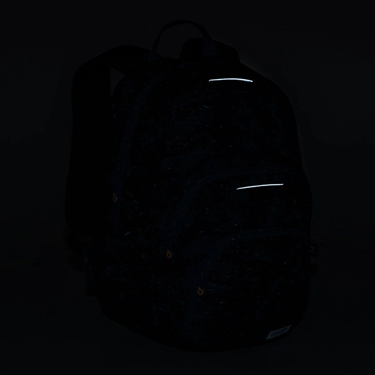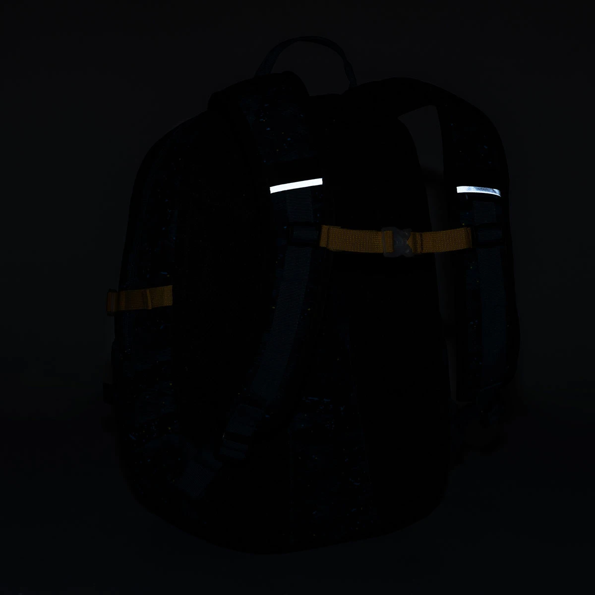 An den Seiten des Rucksacks befinden sich zwei kleinere Taschen. Eine davon ist mit einem Kompressionsriemen ausgestattet, so dass man eine 1,5-Liter-PET-Flasche hineinstellen kann. An der Vorderseite des Rucksacks und an den Schultergurten sind reflektierende Elemente dezent eingearbeitet. Der Rucksack hat eine RegenhĂĽlle sowie einen Boden aus robustem, wasserdichtem TOPDURA-Material.