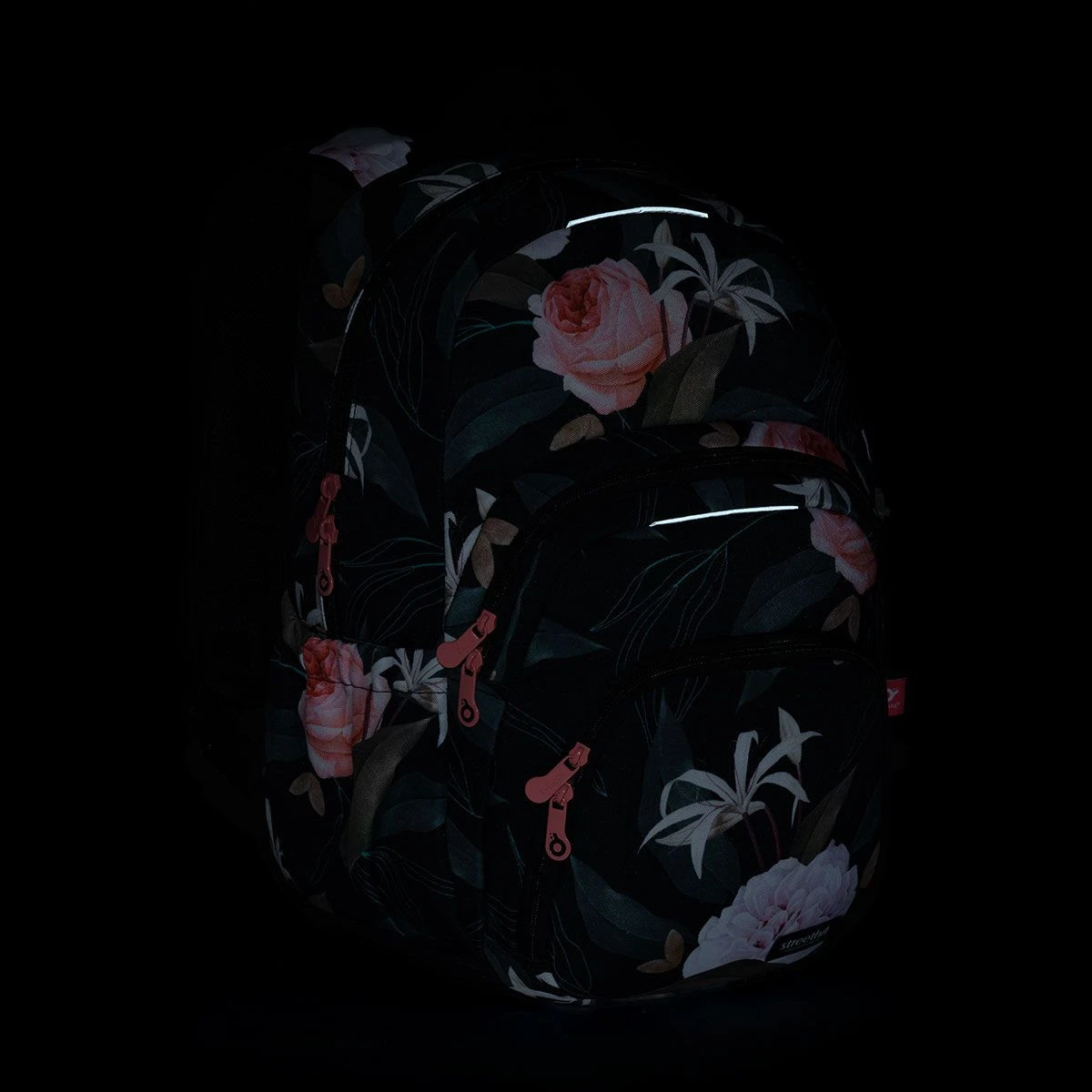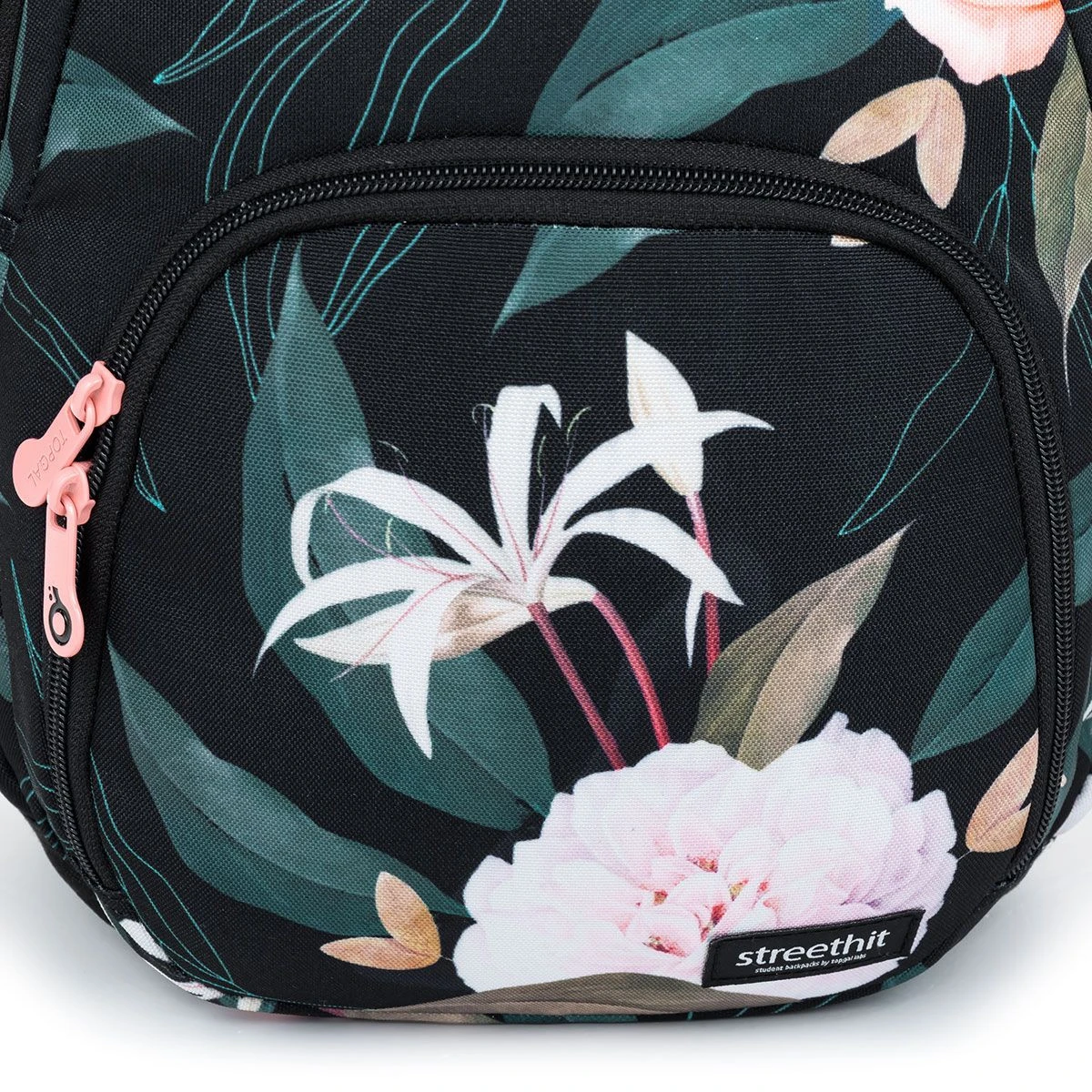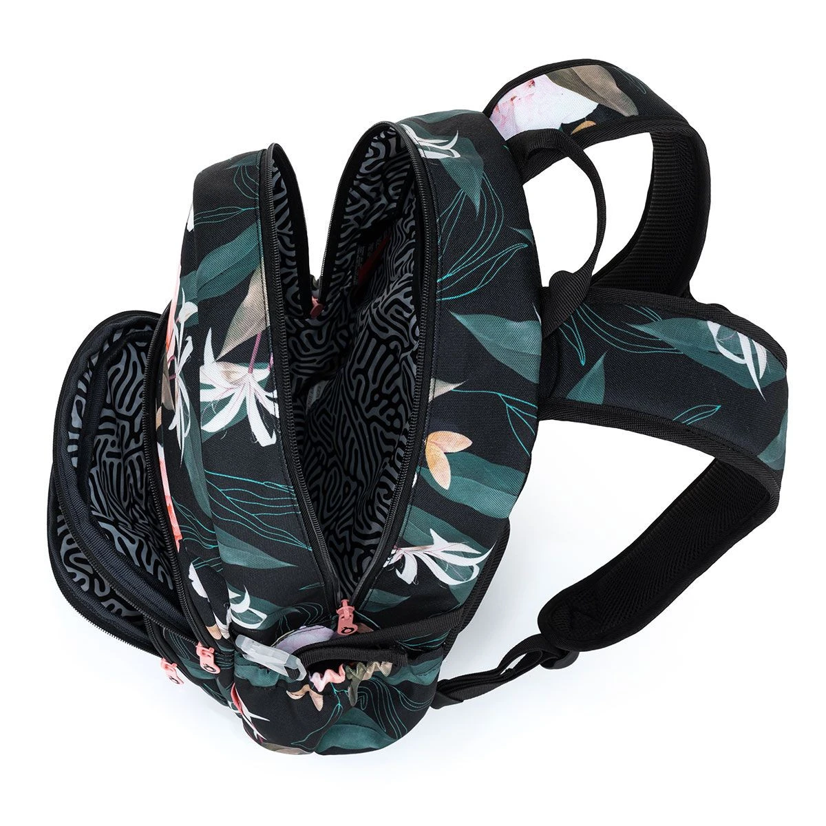 Der blĂĽhende Studentenrucksack passt dank seiner schwarzen Basis zu jedem Outfit. Der SKYE Ein-Kammer-Rucksack ist ein voluminöser Rucksack mit einem fest gepolsterten RĂĽcken, aber geringem Gewicht. Das Fassungsvermögen reicht bis zu 28 Liter. Ein geräumiges Hauptfach fasst alles, was Sie brauchen. Im Inneren der Kammer befinden sich ein gepolstertes Laptopfach, eine praktische Netztasche mit ReiĂźverschluss und ein an einer langen Schnur angenähter SchlĂĽsselkarabiner. In den beiden kleineren Vordertaschen finden weitere Kleinigkeiten Platz – wie das Federmäppchen ETUE 22035 im gleichen Design.