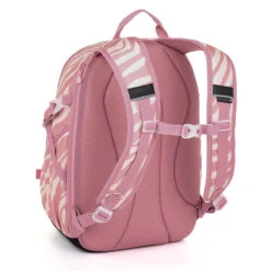 Der hellrosa Schülerrucksack mit Zebra-Tiermuster wird durch einen stylischen Aufnäher ergänzt. Der Rucksack wiegt nur 0,84 kg.